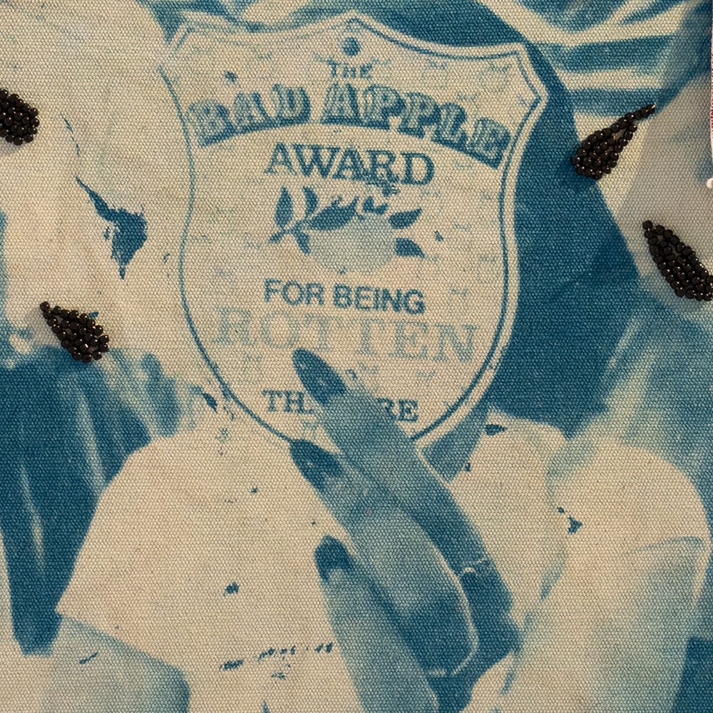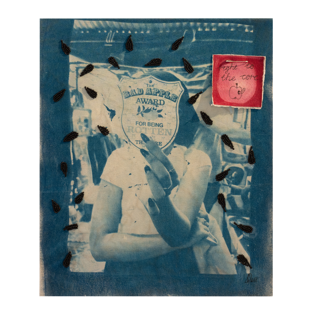 Cyanotype, canvas, fabric dye, found beads. 46 x 38 cm.