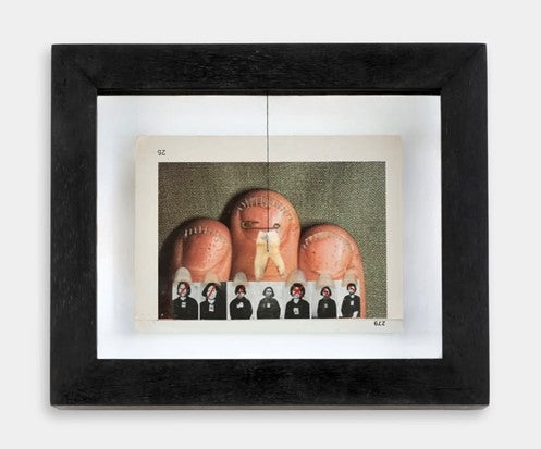 Collage with safety pin, nails, hanging tooth and assorted thread on paper. 17,5 x 21 cm.