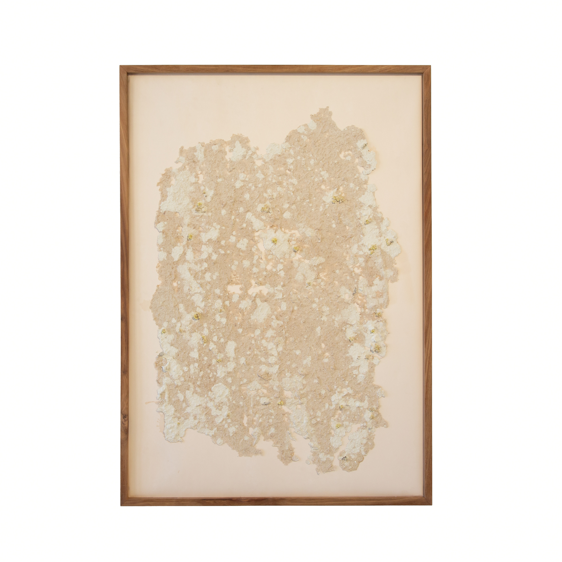 Teabag pulp paper, white stone, impepho flower buds on Fabriano Rosaspina. 100 x 70 cm.