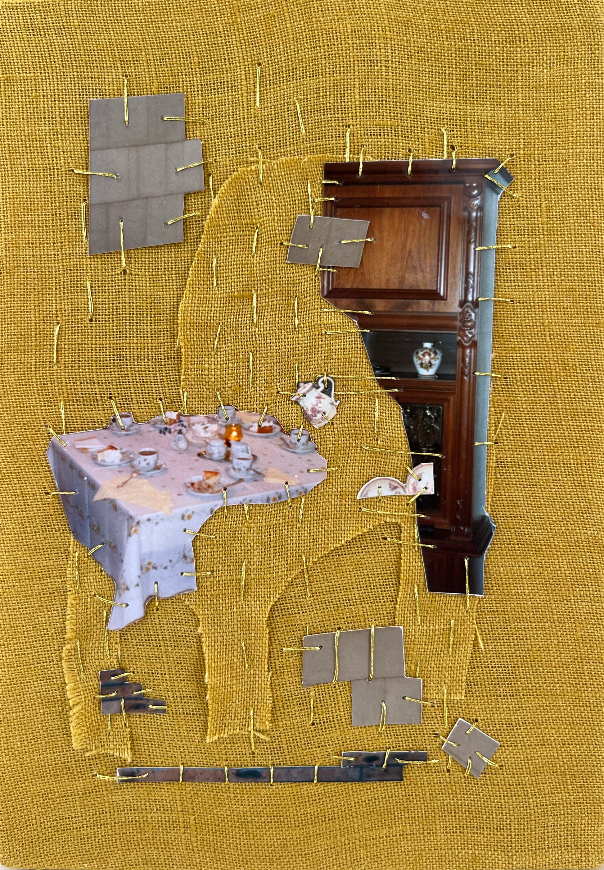 Found photographs and gold thread on linen. 10 x 15 cm.