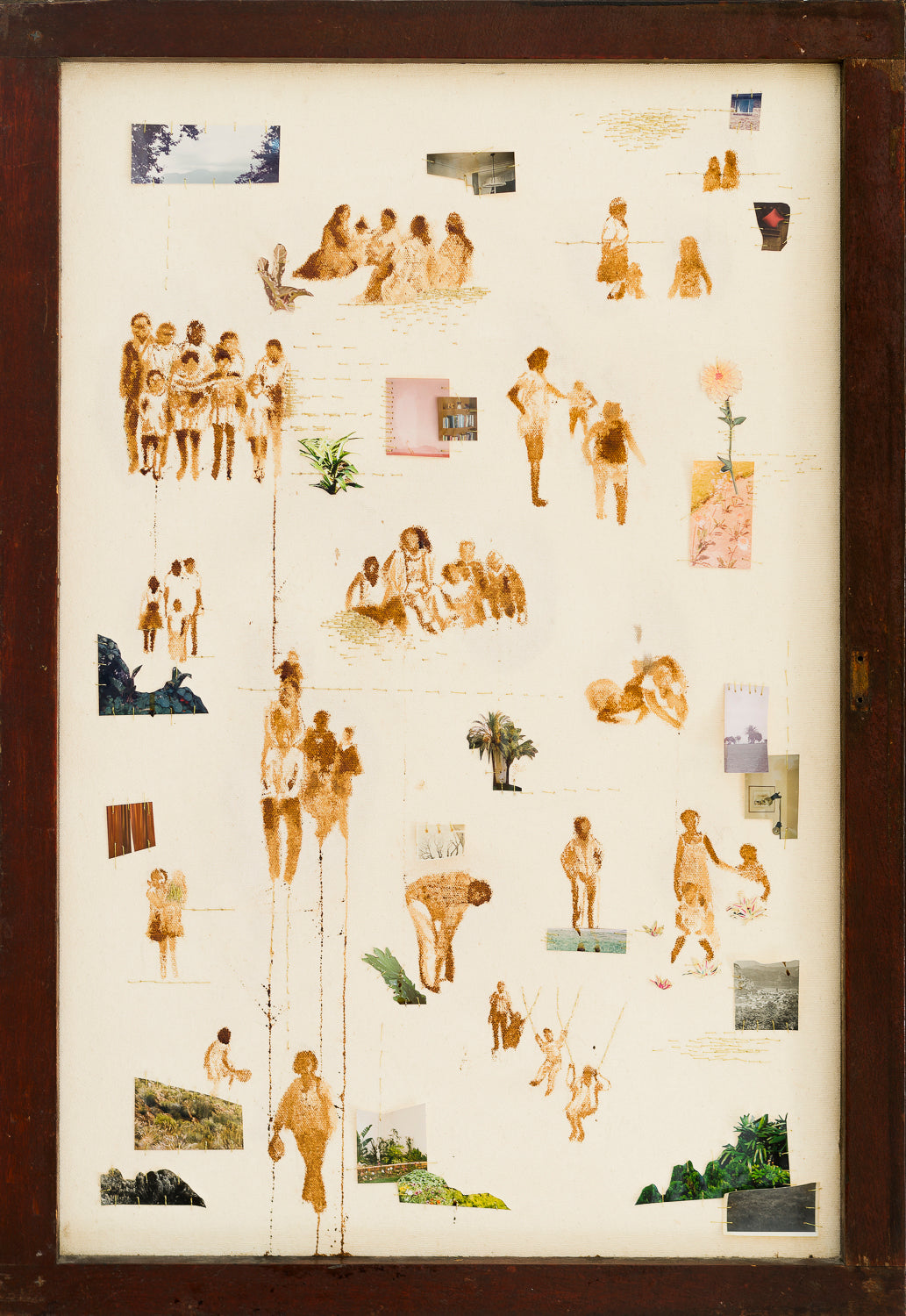 Molasses, found photographs and gold thread on canvas stretched in found frame. 80 x 26 cm.